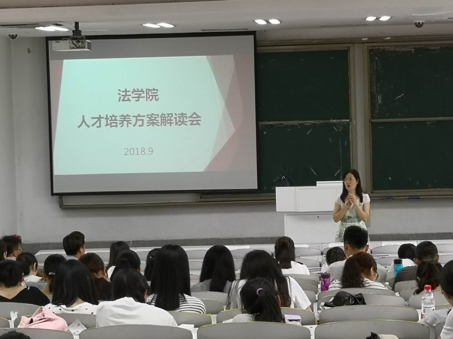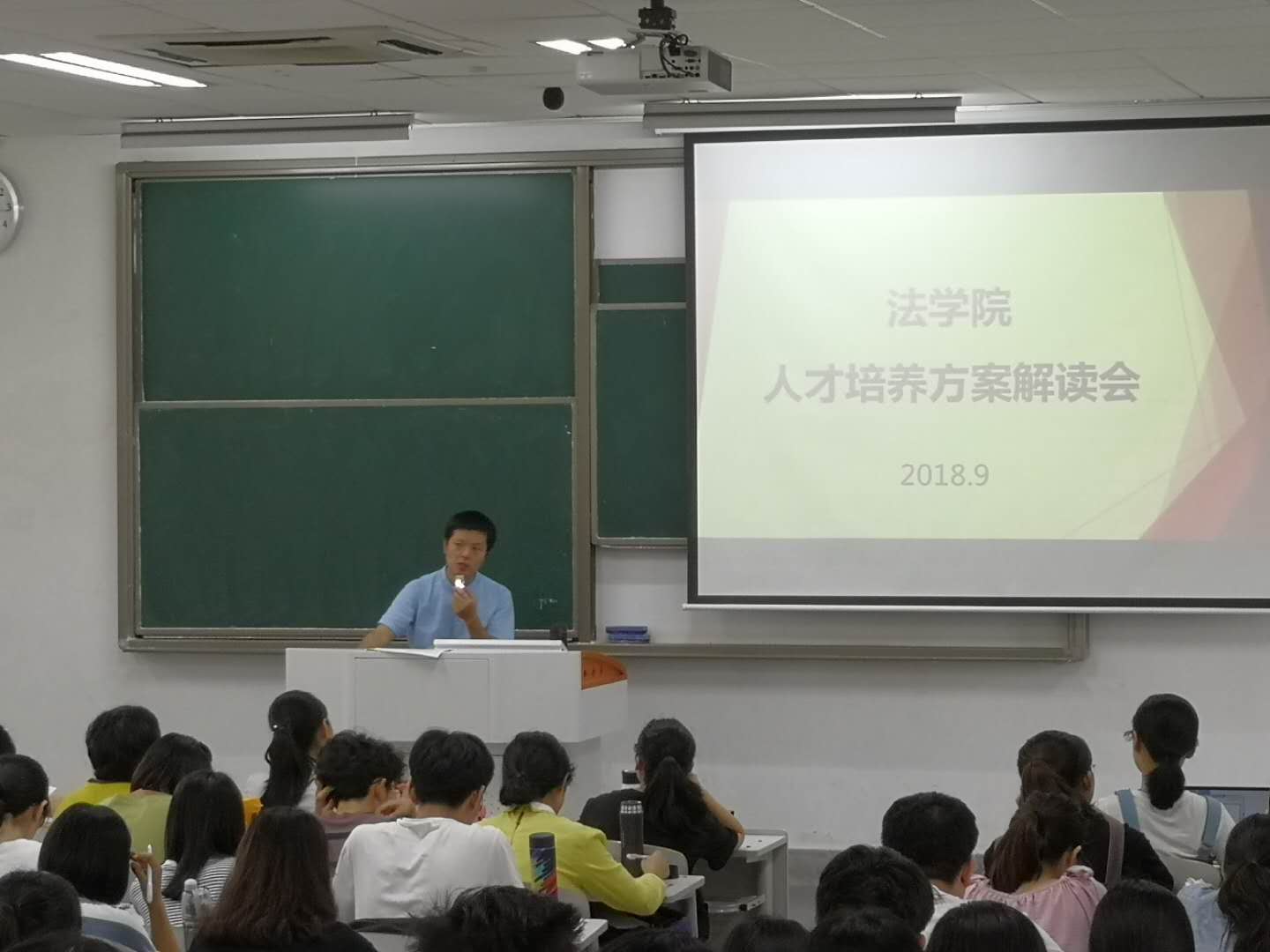 法学系主任孙展望老师在竞北104教室,为法学专业员工详尽地解读了人才培养方案设计的缘由及目标。他认为,人才培养方案犹如专业教育之灵魂,随着新时代对法律人才需求的提高,人才培养方案也必须适应时代发展要求。培养基础知识扎实的应用型法律人才,是公司法律人才培养最终目标。因此,法学专业教学计划分三个方面:通识教育、专业教育、实践教育。首先,他强调了通识教育的重要性和必要性,认为通识教育可以使同学们开阔视野,提高思考效率,特别是辩论赛,可以训练思维能力和语言表达能力,对法学专业技能提高大有裨益。其次,在专业学习方面,法律职业资格考试是评判大学四年专业学习的最好的手段,他建议同学们对专业基础课、学科基础课和专业主干课一定要掌握扎实,而不仅仅满足于及格,同时结合自己的兴趣选修专业课,这样才能面对各种考试游刃有余,才能成长一名合格的法律人;接着,孙老师强调,专业知识最终都要转换成自己的动手能力,实习实践是最有效的方式,他建议同学们尽可能要到公检法机关和律师事务所等单位实习,只有这样,才能将通识教育和专业教育所学知识融合起来,变成实际操作能力;最后,孙老师详细讲解了每一类、每一门课程的设置目的与意义。孙老师还建议同学们要合理安排时间,尽早完成选修课的学习,对毕业论文、大创、实习尽早着手准备,对自己的学习安排要未雨绸缪。另外,孙老师还强调了考研对于未来工作的重要性,为同学们提供了中肯的学习建议。
