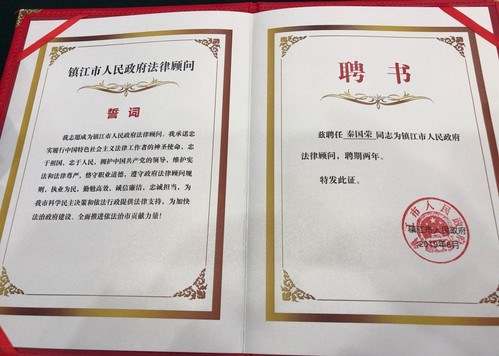 公司秦国荣教授受聘为镇江市政府法律顾问