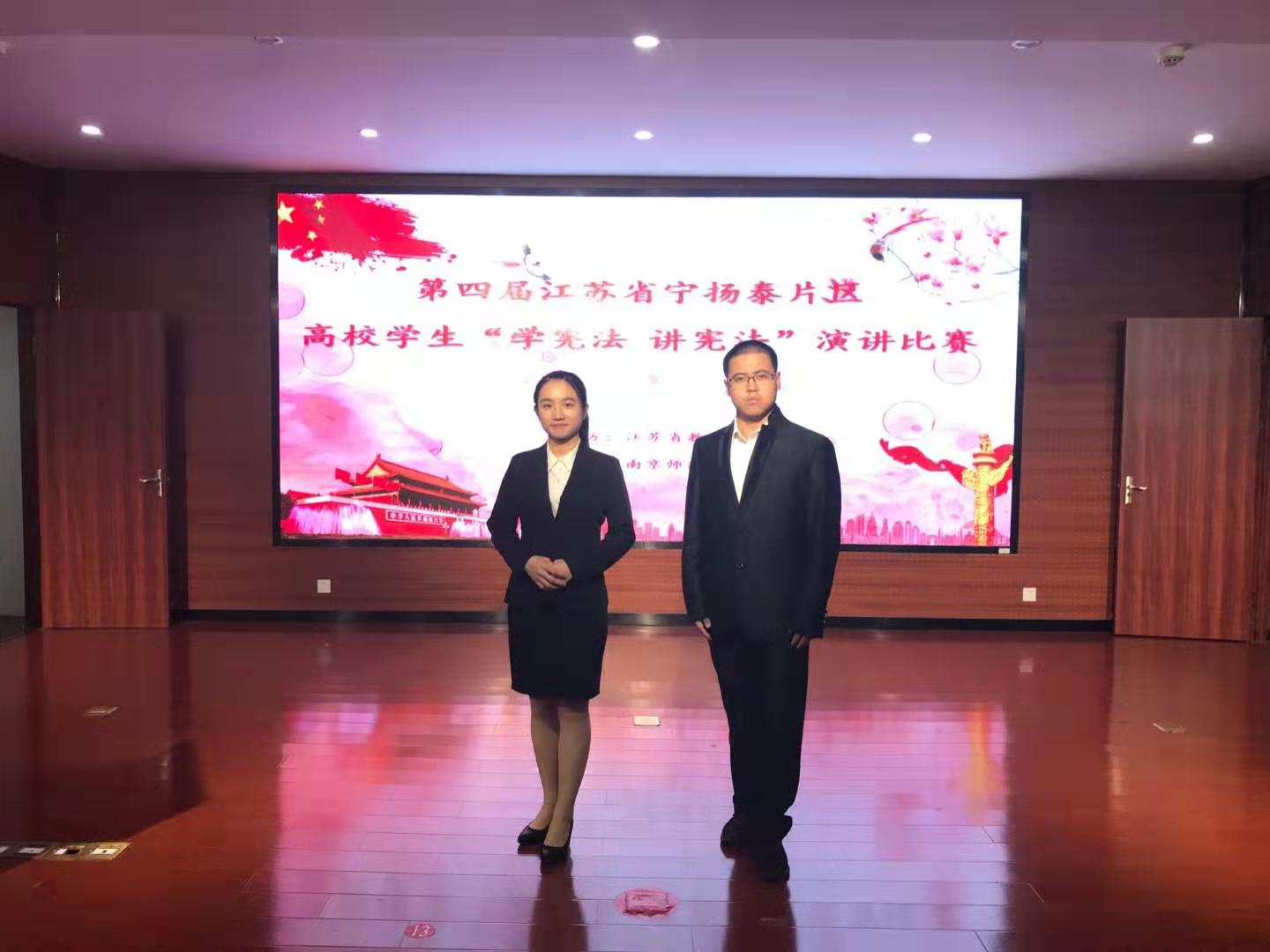 经过前期校内选拔,在法学系主任宪法学博士孙展望老师的指导下,张曹栋、甘璇两位同学代表公司参加了高校片区内比赛。在选拔赛中,张曹栋同学以总分排名第四的好成绩成功晋级省级决赛;甘璇同学则以她与宪法的故事等演讲,展现了南审学子“学宪法讲宪法”的热情。