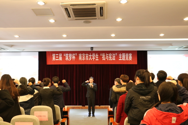 为深入贯彻党的十九大和十九届四中全会精神,认真落实党中央关于深入学习宣传和贯彻落实宪法的有关精神,深化2019年“国家宪法日”宣传教育活动, 12月11日下午第三届“筑梦杯”南京市老员工“我与宪法”主题竞赛在公司教学法庭举行。省司法厅一级调研员、省普法志愿者总队办公室副主任唐俊,市司法局副巡视员周发生,市司法局法治宣传处处长杨茂荣,区司法局局长叶雪峰,区司法局副局长张兴国,太阳成集团122ccvip经理刘爱龙,太阳成集团122ccvip副经理王艳丽,法学实践中心主任秦康美等应邀出席了活动。本次比赛有来自南京师范大学、南京工业大学以及法律实务部门的专家担任评委。