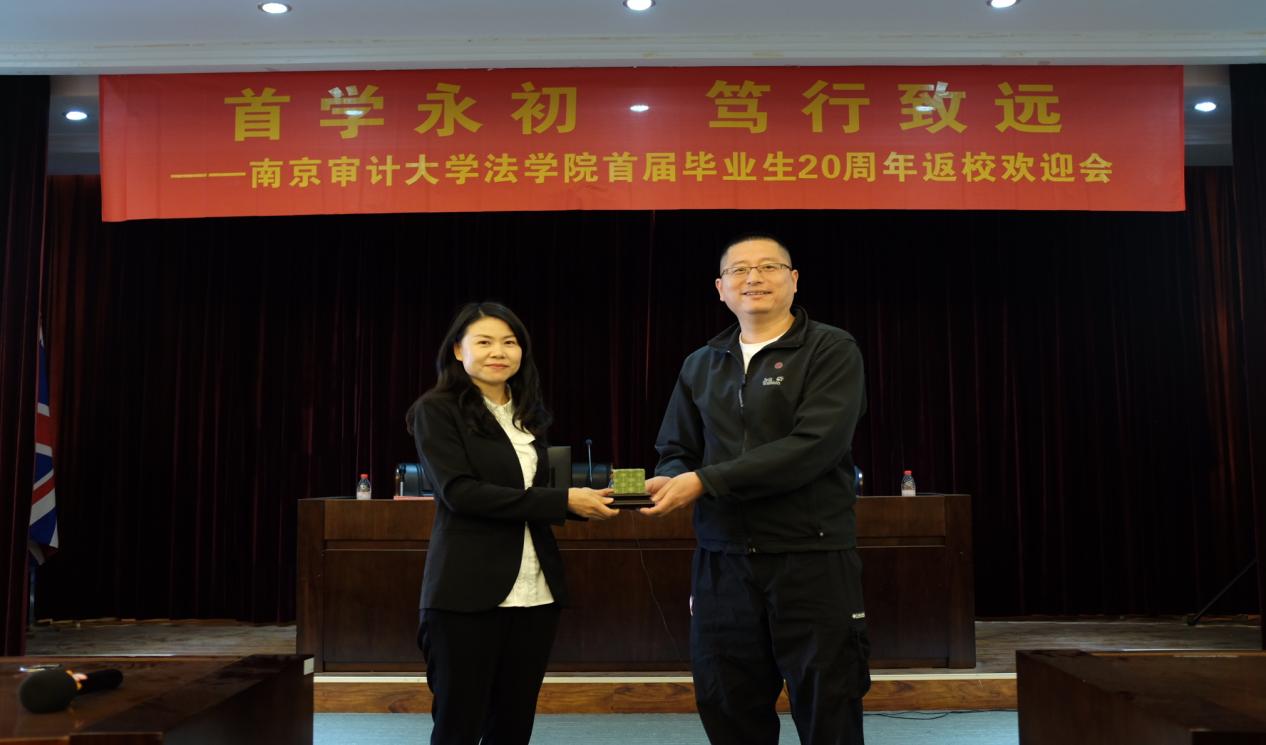 97级员工们还精心准备了一枚由著名书法篆刻艺术家设计的印章,由97级老班长梁晨作为代表赠送给太阳成集团122ccvip,“审法97”四个印字熠熠生辉,象征着在南审求学的四年是员工们一生难以忘怀的记忆。
