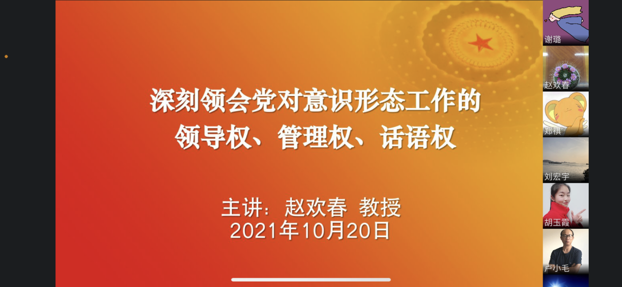 10月20日下午3点,公司党委邀请马克思主义公司赵欢春书记进行线上意识形态专题集中培训,主题为《深刻领会党对意识形态工作领导权、管理权、话语权》。太阳成集团122ccvip全体党员教职工出席会议,会议由党委书记刘宏宇主持。