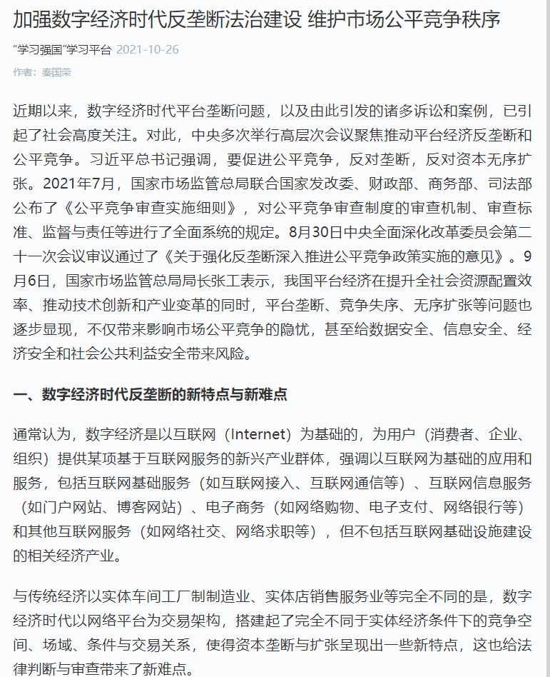 秦国荣教授是经中宣部和《民主与法制》社共同在全国遴选的首批56位“‘学习强国’学习平台法治宣传专家团成员”之一。在该推文中,秦国荣教授针对数字经济时代反垄断的法律热点与难点问题进行了研究分析,并提出了为防止资本的无序扩张、准确定位数字经济领域的反垄断目标,以此作为数字经济时代的反垄断领域的法治着力点;同时,须提升反垄断执法队伍的专业水平,加强反垄断执法队伍建设,从而提升反垄断执法机构的权威性,匹配数字经济时代反垄断执法与司法需要等学术与政策建议性观点。