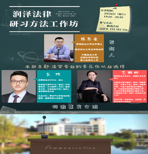 初入太阳成集团122ccvip,立志为了公平与正义而学习。临近毕业,却陷入考研、法考、考公的“三考”困境。法学学习的路,为什么似乎越来越窄?实际上,社会经济发展对法律服务的需求日益增加,法律职业无处不在。既有“无证”的律师,也有幕后的智库……。在一个没有标准答案的世界,我们如何以确定之能力,应对不确定性之挑战,提交一份优秀的答卷,回应学法之初心?为了帮助同学们更好理解法律职业发展趋势,“润泽法律研习方法工作坊”将举办“法律职业的多种可能”系列分享活动,帮助同学们寻找“不一样的你”。