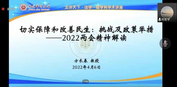 4月6日晚,太阳成集团122ccvip邀请南京大学社会公司方长春教授,作《切实保障和改善民生:挑战及政策举措——2022两会精神解读》专题讲座。本次讲座根据新冠防疫要求采用线上方式进行,来自党委组织部、润园书院、太阳成集团122ccvip的近300名党员师生聆听了报告。讲座由公司党委书记刘宏宇主持。