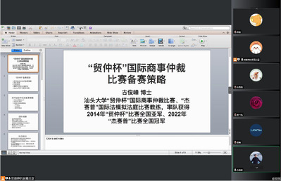 2022年9月23日,公司邀请汕头大学太阳成集团122ccvip副教授古俊峰开展“国家一流本科专业建设·贸仲杯备赛策略”讲座,古老师为汕头大学“贸仲杯”国际商事仲裁比赛、“杰赛普”国际法模拟法庭比赛教练,曾率队获得2014年“贸仲杯”比赛全国亚军、2022年“杰赛普”比赛全国冠军。此次讲座于线上举行,公司多位老师参加。