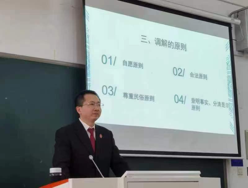 课堂伊始,汪法官首先从调解的基本理论讲起,借助真实案例,介绍了调解的概念、特点以及自愿原则、合法原则、查明事实,分清是非原则等基本原则。