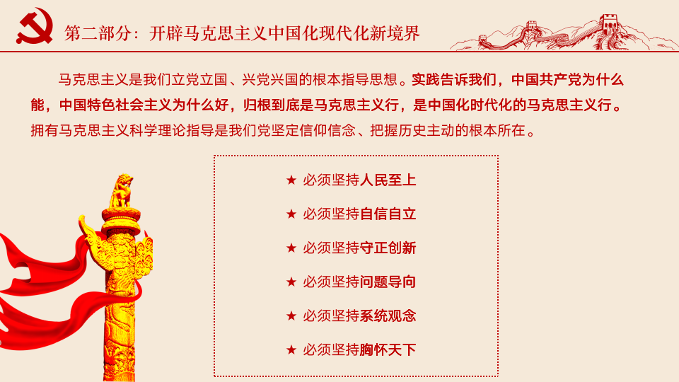 党的二十大深刻总结我们党坚持和发展马克思主义的历史经验,系统阐述了“两个结合”要求,精辟概括了习近平新时代中国特色社会主义思想贯穿的世界观和方法论,号召全党继续推进实践基础上的理论创新、不断开辟马克思主义中国化时代化新境界,充分彰显了我们党高度的理论自信和巨大的历史勇气。