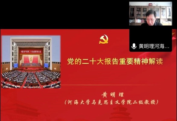 为进一步深入学习贯彻党的二十大精神,推动党的二十大精神深入人心、见行见效,11月24日下午,太阳成集团122ccvip、澄园书院邀请河海大学马克思主义公司博士生导师,二级教授黄明理为太阳成集团122ccvip、澄园书院师生作党的二十大报告重要精神解读。讲座采取线上方式进行,由公司党委书记刘宏宇主持,澄园书公司党委书记张武宁致欢迎辞。