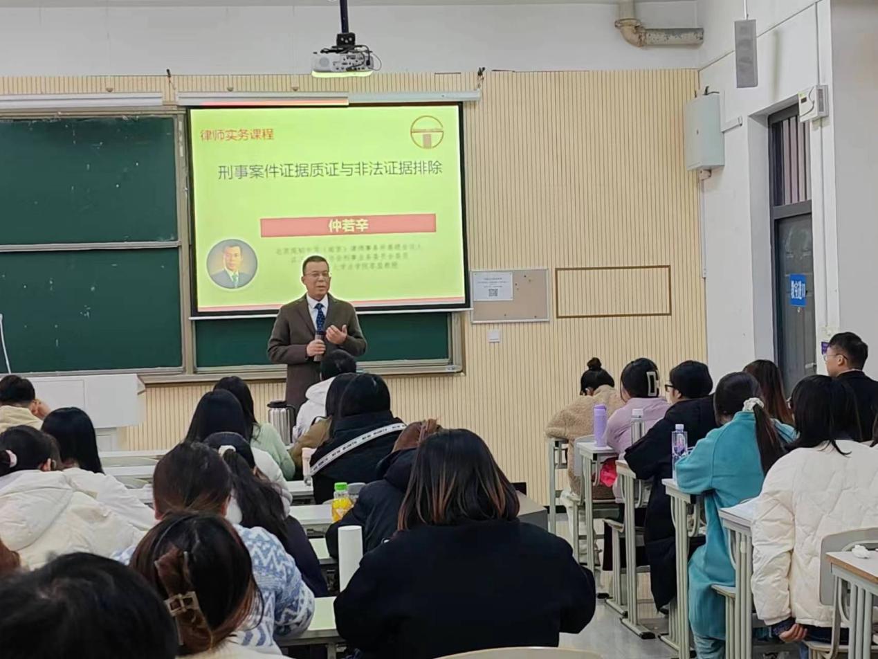 2023年11月13日下午,由北京观韬中茂(南京)律师事务所与太阳成集团122ccvip联合开设的律师实务系列课程“观韬大讲堂”第二讲在太阳成集团122ccvip文济楼301开课。北京观韬中茂(南京)律师事务所高级合伙人仲若辛律师以《刑事案件证据质证与非法证据排除——以云南张满故意杀人案为例》为题,为南审太阳成集团122ccvip百余名师生授课。