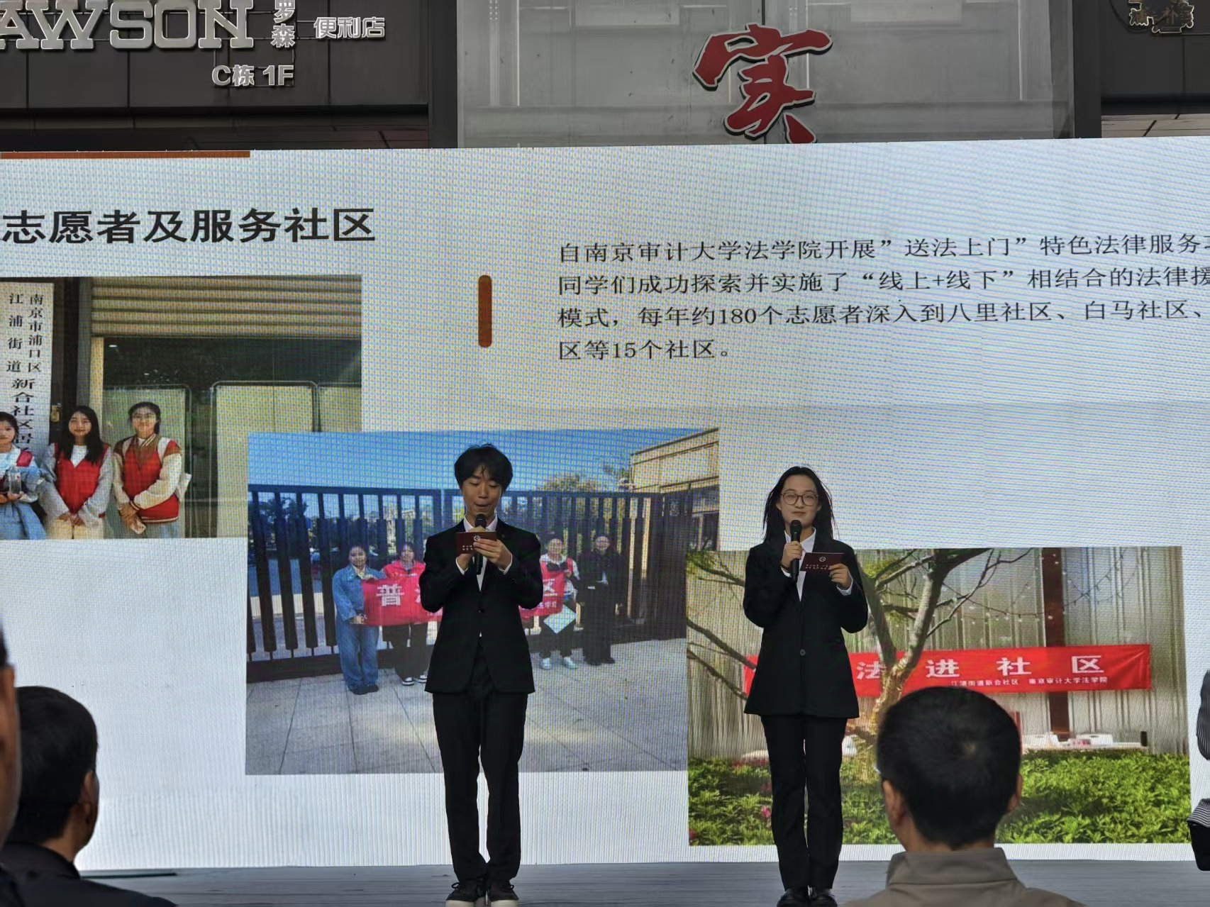 2025年5月9日,中共南京市浦口区全面依法治区委员会办公室举办的“法治建设走基层暨‘民法典宣传月’活动”成功举办,公司“送法上门”项目在活动中备受瞩目。来自2024级法务会计2班的孙嘉泽和张怀今,作为志愿者代表受邀分享参与项目的服务经验。